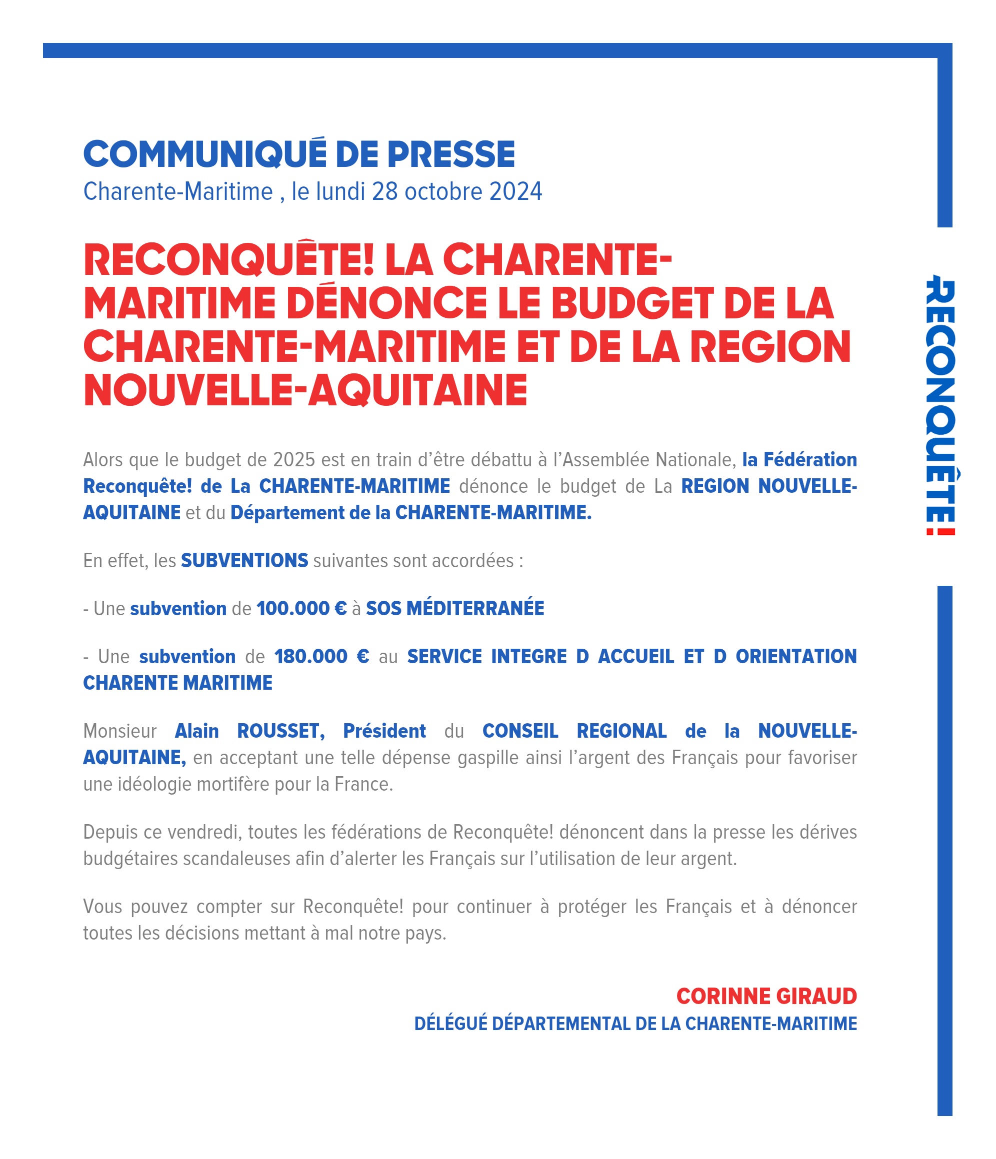 Alors que le budget de 2025 est en train d’être débattu à l’Assemblée Nationale, la Fédération Reconquête! de La CHARENTE-MARITIME dénonce le budget de La REGION NOUVELLE-AQUITAINE et du Département de la CHARENTE-MARITIME.